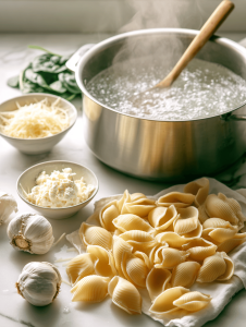 Step 2: Cook the pasta shells in boiling salted water until just al dente, about 8 minutes.