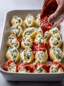 - Arrange the stuffed shells snugly in a baking dish, facing up and side by side.