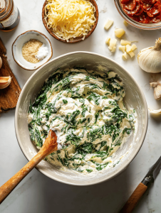 - In a mixing bowl, combine ricotta cheese, shredded mozzarella, chopped spinach, and minced garlic. Mix until well blended and creamy, adding salt and pepper to taste.