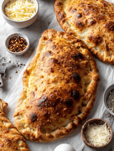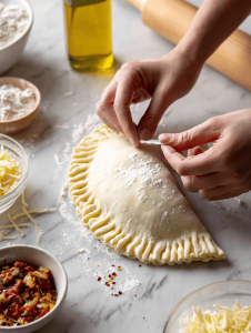 - Transfer the shaped calzones to the prepared baking sheet, brush the tops with beaten egg for a shiny finish, and sprinkle with herbs or spices if desired.